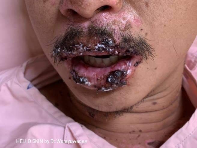 ความผิดปกติที่เห็น เราสามารถบรรยายลักษณะผื่นได้ว่า “Hemorrhagic crusts of lips and vermillion”