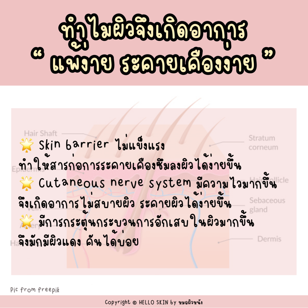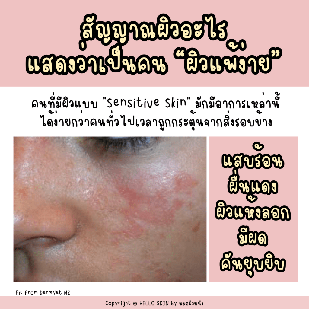 🌟 ดังนั้น คนกลุ่มนี้อาจมีการระคายเคือง รู้สึกไม่สบายผิว หน้าแห้ง แดง คันยุบยิบ หรือลอกได้ เวลาที่มีปัจจัยกระตุ้นที่กล่าวไปข้างต้น ซึ่งความรุนแรงของอาการก็แล้วแต่บุคคล