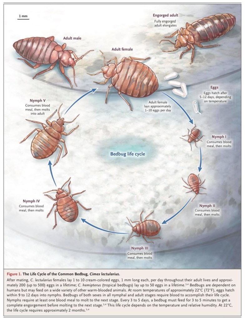 วงจรชีวิต (ตามรูป) มี 6 ระยะ อายุประมาณ 4-5 เดือน แต่ถ้าขาดอาหารอาจอยู่ในอุณหภูมิห้องได้ 70 วัน ซึ่งถือว่ายาวนานมาก