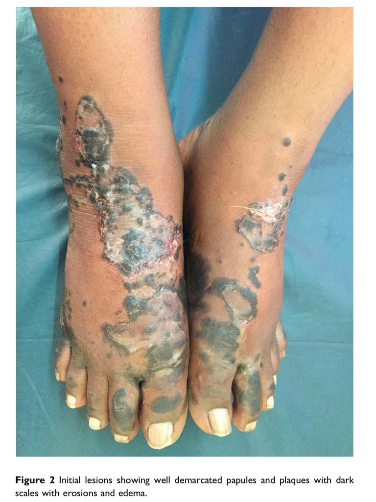 บรรยายว่า demarcated thick hyperpigmented plaque with adherent scales, occasional pustules (Figure 3)