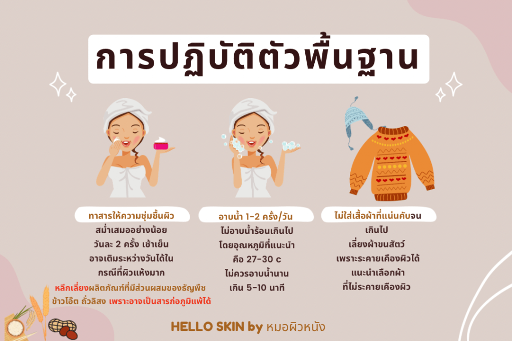 ✔️ ดูแลผิวหนังโดยการทาสารให้ความชุ่มชื้นผิวอย่างสม่ำเสมอ อย่างน้อยวันละ 2 ครั้ง เช้าเย็น และ อาจเติมระหว่างวันได้ในกรณีที่ผิวแห้งมาก