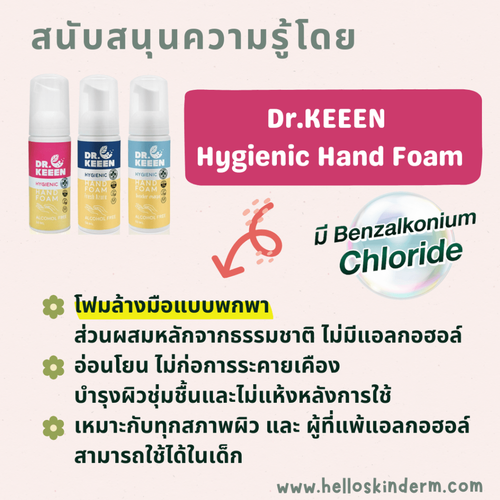 ตัวอย่างโฟมล้างมือแบบพกพาที่มี BKC ที่อ่อนโยน ใช้ได้ทุกสภาพผิว เช่น Dr.KEEEN Hygienic Hand Foam [ดูรายละเอียดเพิ่มเติมท้ายบทความ]