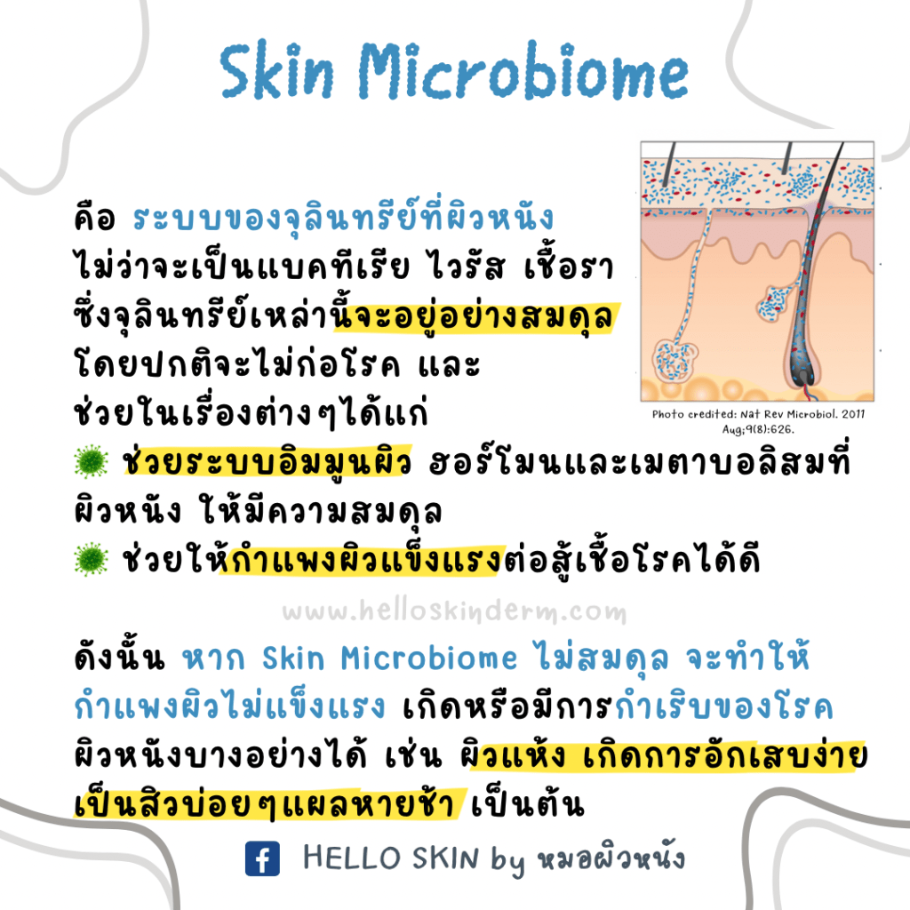 ดังนั้น หาก Skin Microbiome ไม่สมดุล จะทำให้กำแพงผิวไม่แข็งแรง เกิดหรือมีการกำเริบของโรคผิวหนังบางอย่างได้ เช่น ผิวแห้ง เกิดการอักเสบง่าย เป็นสิวบ่อย ๆ แผลหายช้า เป็นต้น