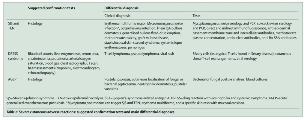 ควรต้องสงสัย DRESS syndrome สิ่งที่ต้องทำคือ ตรวจหาว่ามีสาเหตุอื่นนอกเหนือจากยาหรือไม่ และทำการคำนวณ DRESS score