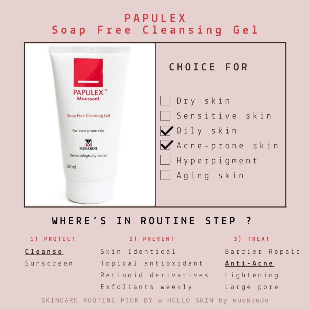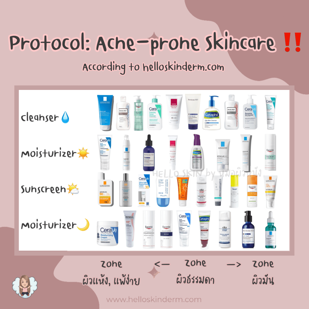 - เลือกผลิตภัณฑ์ที่เหมาะกับ acne-prone skin ได้แก่ non-comedogenic, oil free