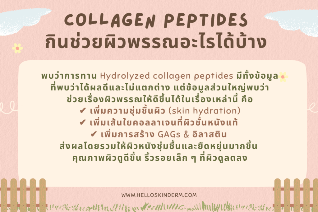 มีข้อมูลทางคลินิกและในหลอดทดลอง พบว่าการทาน Hydrolyzed collagen peptides มีทั้งข้อมูลที่พบว่าได้ผลดีและไม่แตกต่าง แต่ข้อมูลส่วนใหญ่พบว่าช่วยเรื่อง ผิวพรรณให้ดีขึ้นได้ในเรื่องเหล่านี้ คือ