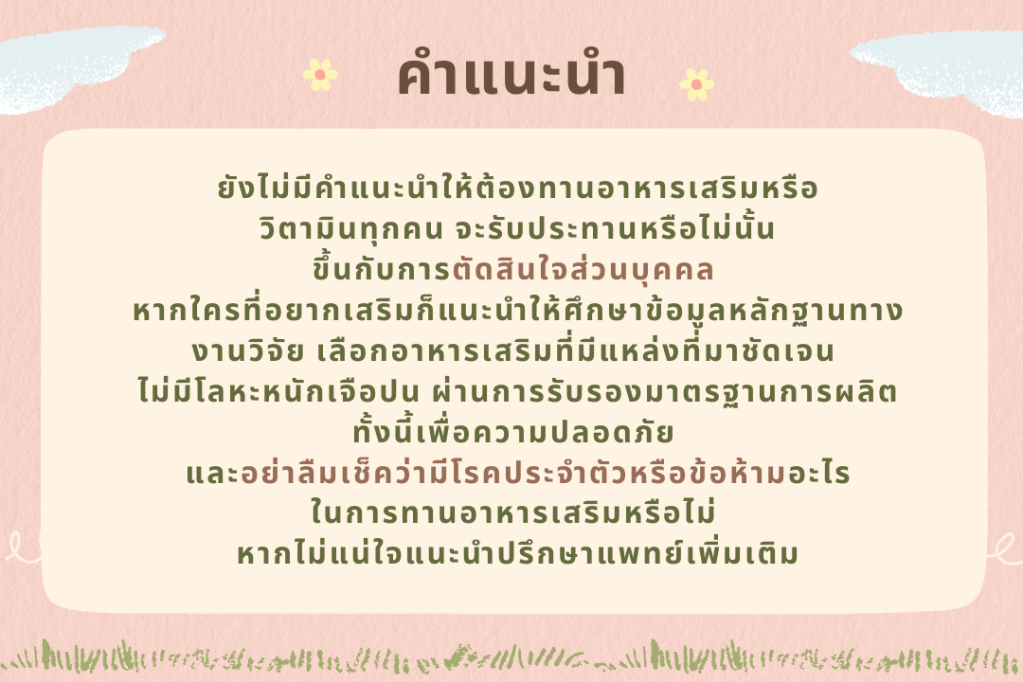 ยังไม่มีคำแนะนำให้ต้องทานอาหารเสริมหรือวิตามินทุกคน อย่างที่บอกคือเป็นอาหารเสริม การจะรับประทานหรือไม่นั้น ขึ้นกับการตัดสินใจส่วนบุคคล หากใครที่อยากเสริมก็แนะนำให้ศึกษาข้อมูลหลักฐานทางงานวิจัย เลือกอาหารเสริมที่มีแหล่งที่มาชัดเจน ไม่มีโลหะหนักเจือปน ผ่านการรับรองมาตรฐานการผลิต ทั้งนี้เพื่อความปลอดภัย และ อย่าลืมเช็คว่ามีโรคประจำตัวหรือข้อห้ามอะไรในการทานอาหารเสริมหรือไม่ หากไม่แน่ใจแนะนำปรึกษาแพทย์เพื่อขอคำแนะนำเพิ่มเติมค่ะ