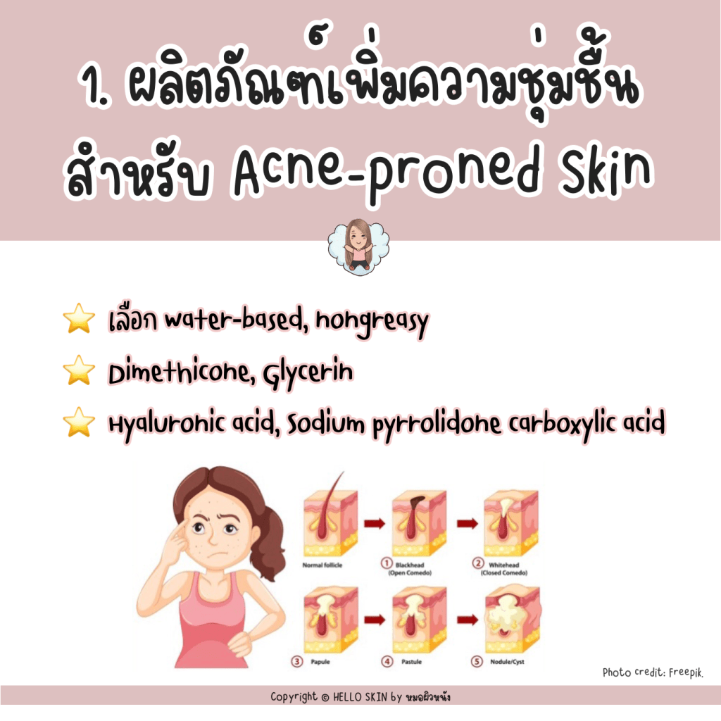 เคล็ดลับการเลือกสกินแคร์สำหรับคนที่เป็นสิว มีผิวมัน แต่ขาดน้ำ แนะนำมองหาคุณสมบัติที่แก้ไขข้อบกพร่องตามข้างต้น ดังนี้