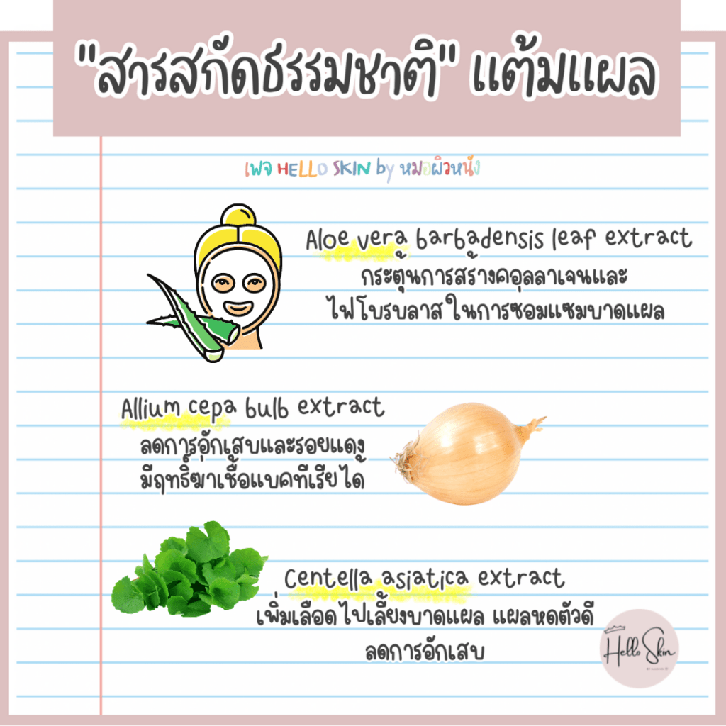 • Centella asiatica extract ช่วยเพิ่มเลือดไปเลี้ยงบาดแผล บาดแผลหดตัวดี มีฤทธิ์ต้านการอักเสบช่วยลดอาการบวมแดงได้ดี ผลคือช่วยให้หายเร็วขึ้น
